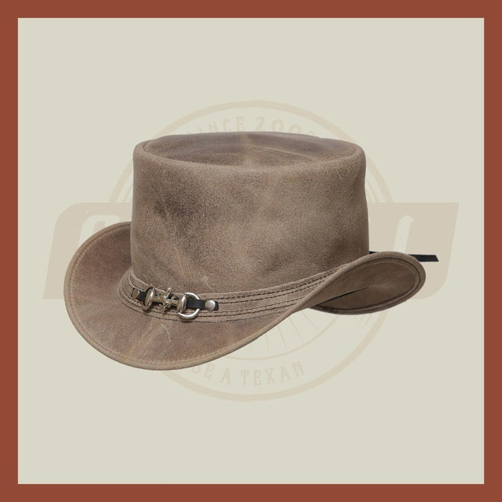 Tags: Crazy Horse leather, horse bit band, classic riding top hat, vintage style, equestrian fashion, timeless charm, refined taste, fashion-forward.