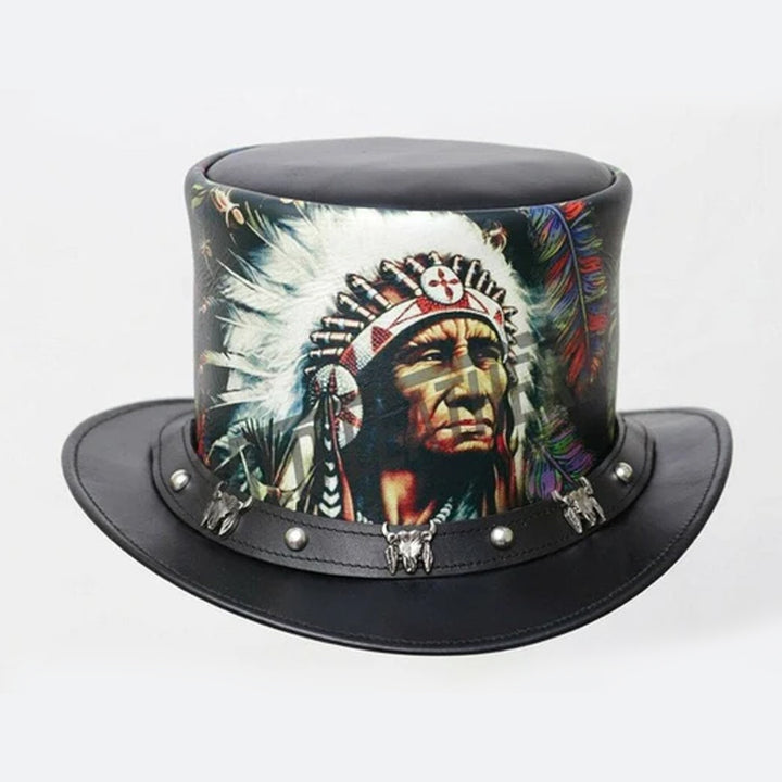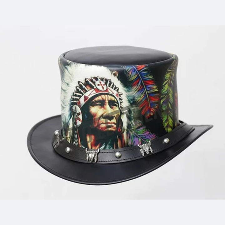 If you're a fan of Native American culture or just looking for a unique top hat, this Red Indian Feather Head Native American Leather Top Hat is the perfect accessory for you. Don't miss the chance to make a statement with this one-of-a-kind hat. Get yours now!
