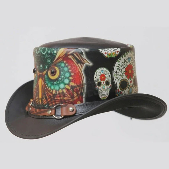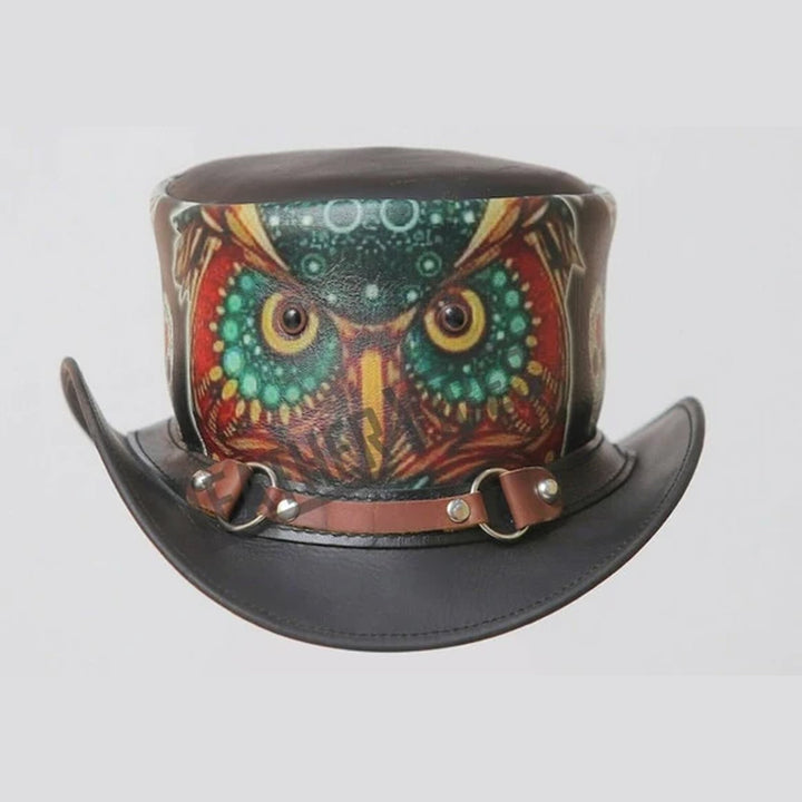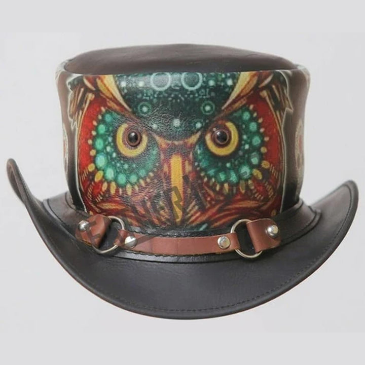 Crafted with high-quality leather, this top hat showcases a rustic and worn-in aesthetic that adds an air of authenticity to your ensemble. The intricate owl and skull ring band adds a touch of mystique and intrigue, symbolizing wisdom and the allure of the unknown.