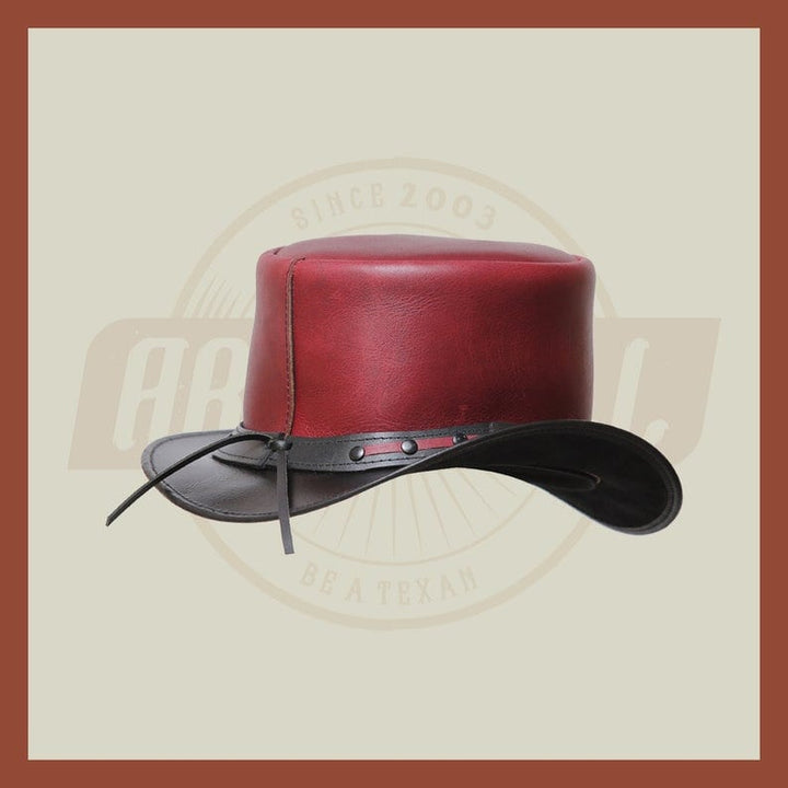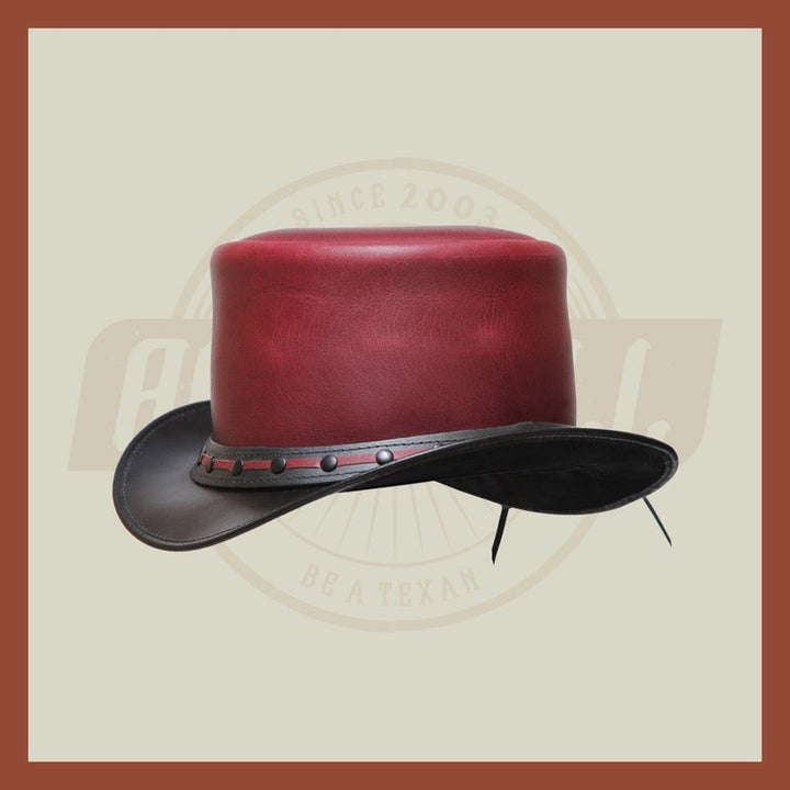 Crafted with purplish leather, this top hat exudes a sense of elegance and uniqueness. The rich hue adds a pop of color that sets you apart from the crowd. The black revit band further enhances the edgy and rebellious appeal, showcasing your fearless spirit.